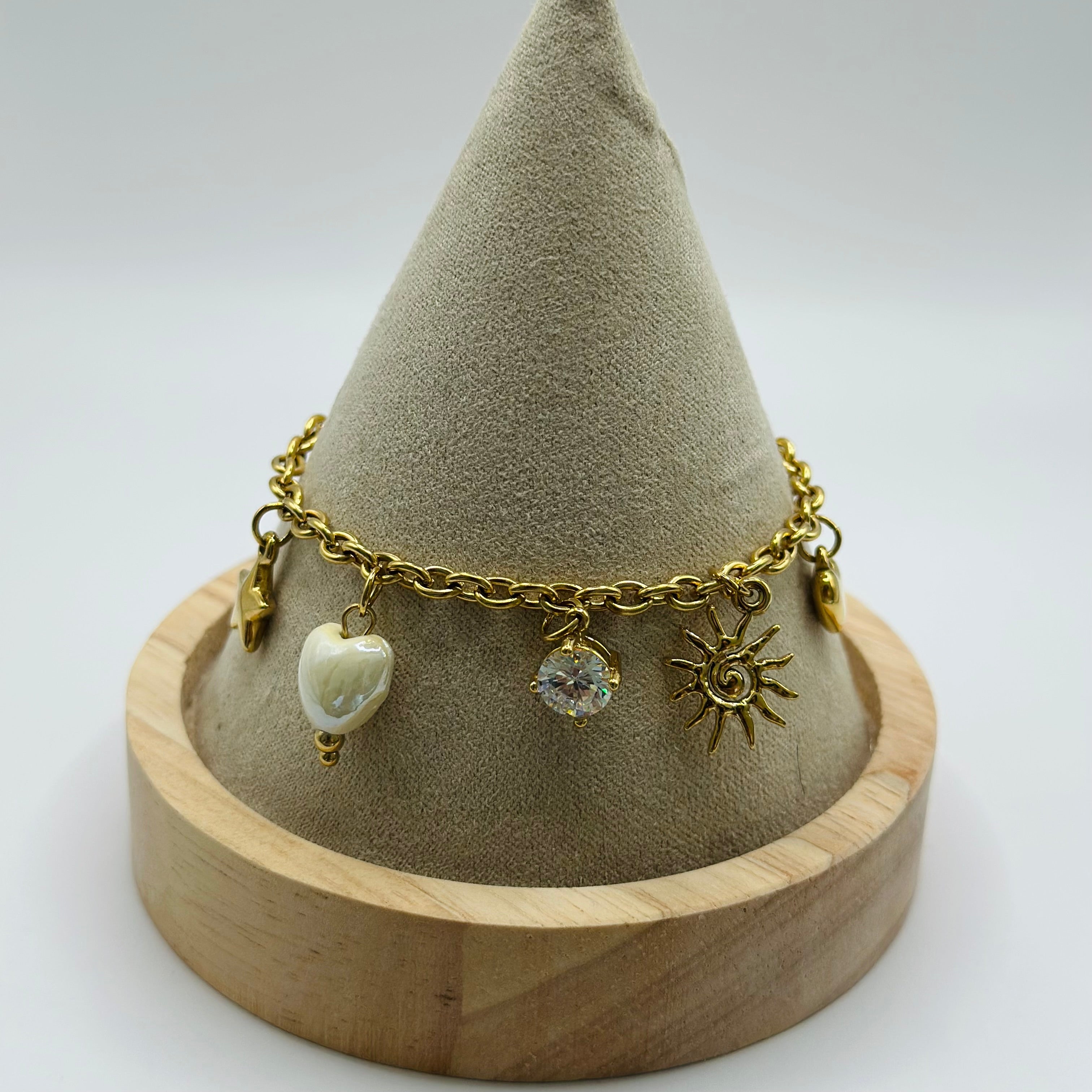Un ciel au poignet. Aurora réunit les symboles de l’amour, de la lumière et des rêves dans un bracelet délicat et chargé d’émotion. Cœur nacré, soleil protecteur, étoile scintillante… chaque pendentif murmure un message.