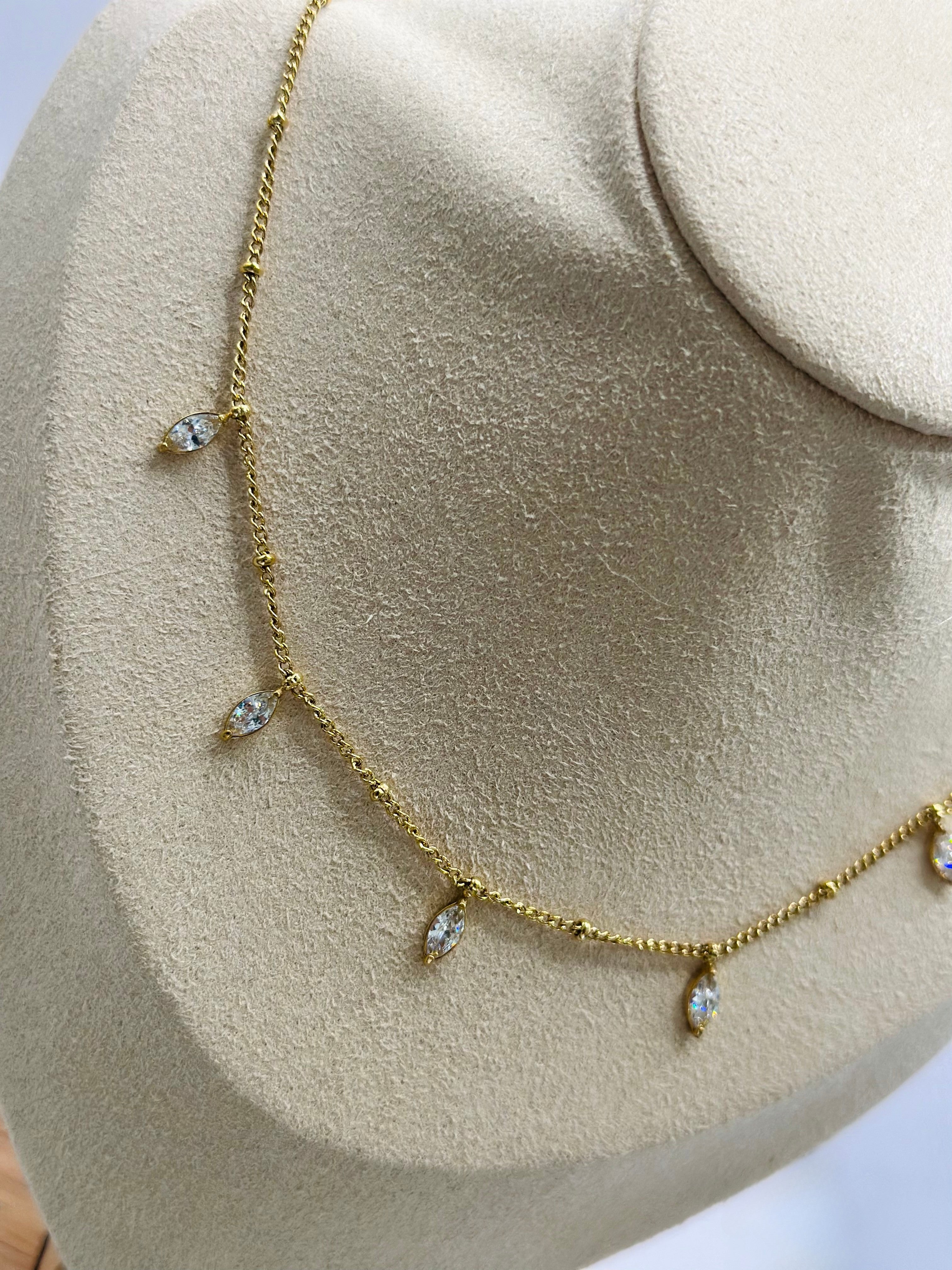 Le collier Sandra attire tous les regards avec ses pampilles serties en forme de navette, finement suspendues le long d’une chaîne dorée. Chaque cristal capte la lumière avec élégance, comme des gouttes de lumière dansantes au creux du cou. Un bijou à la fois sophistiqué et aérien.