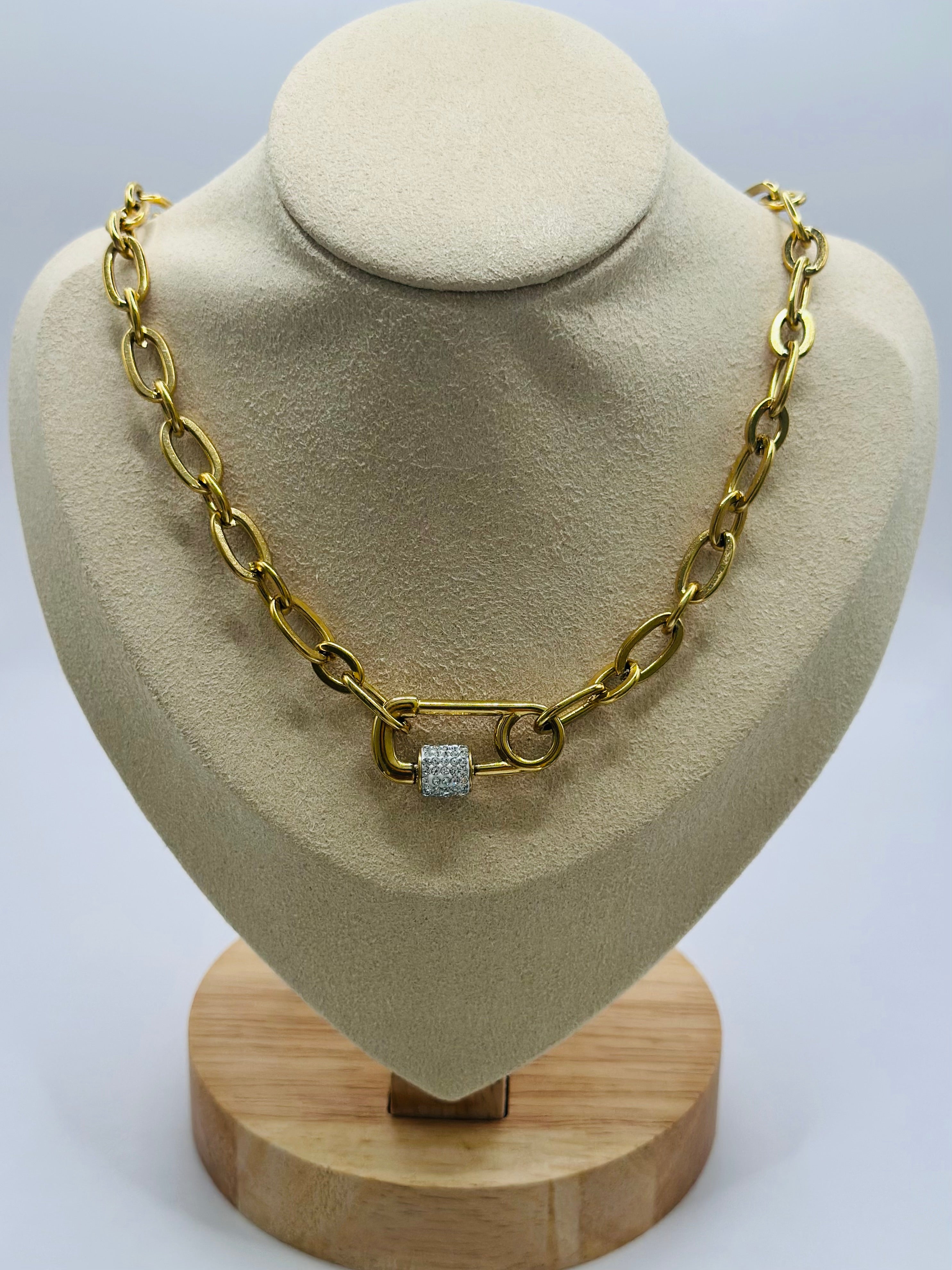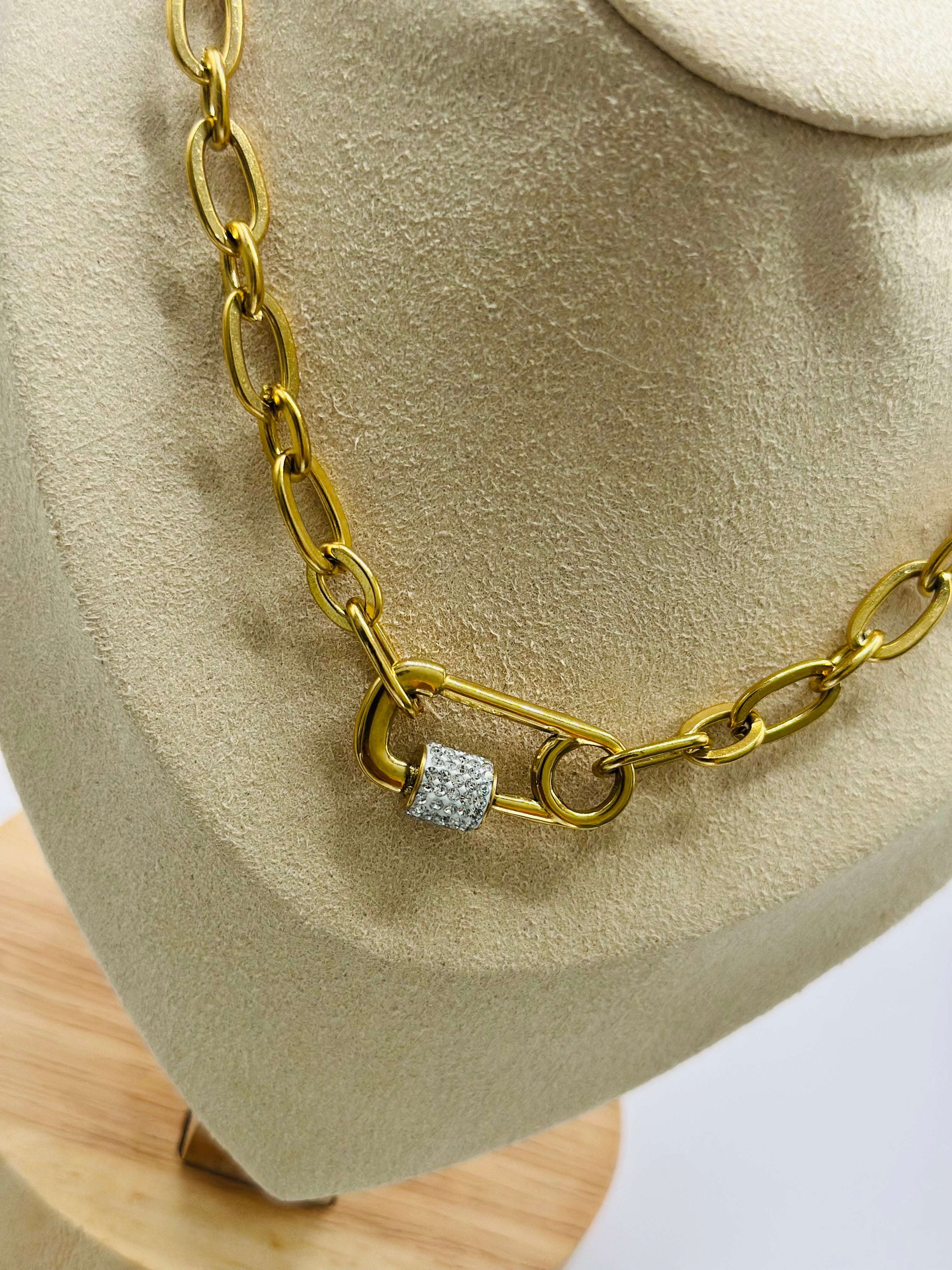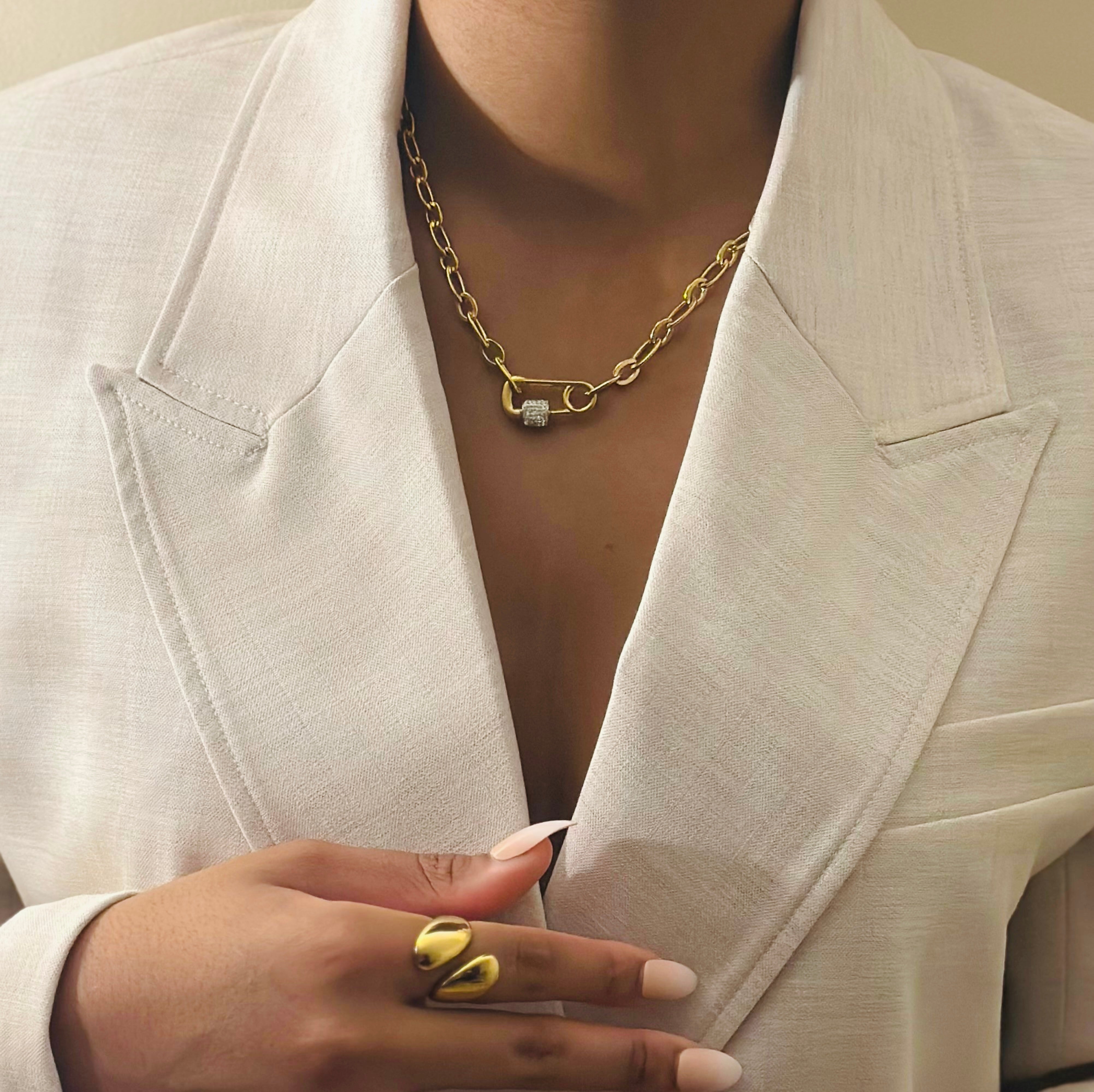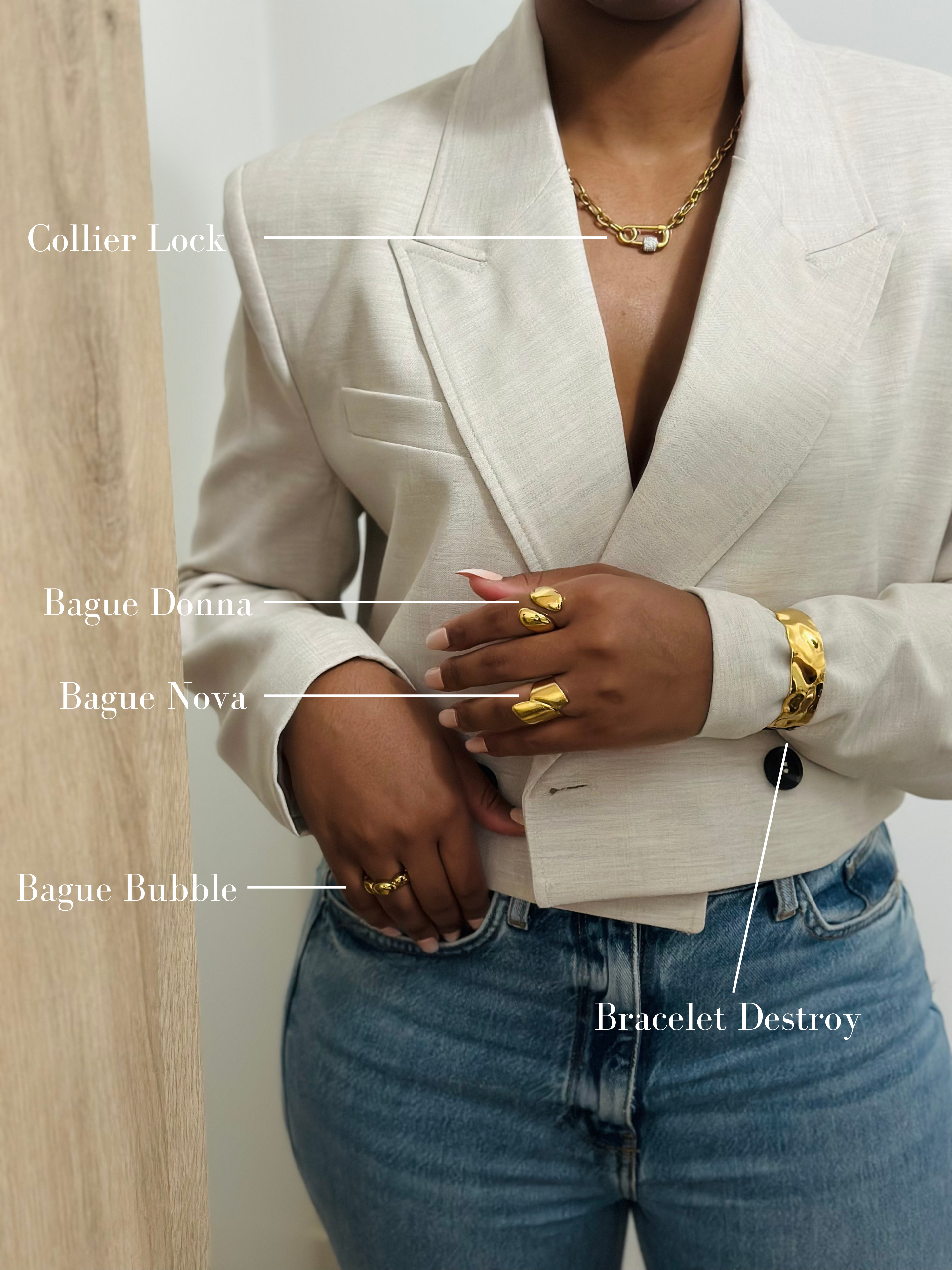 Le collier Lock joue avec les codes de la joaillerie contemporaine. Sa chaîne à larges maillons dorés s’impose avec style, tandis que son fermoir façon cadenas incrusté de strass ajoute une touche de brillance subtile. Un bijou statement pour celles qui veulent affirmer leur force avec élégance.