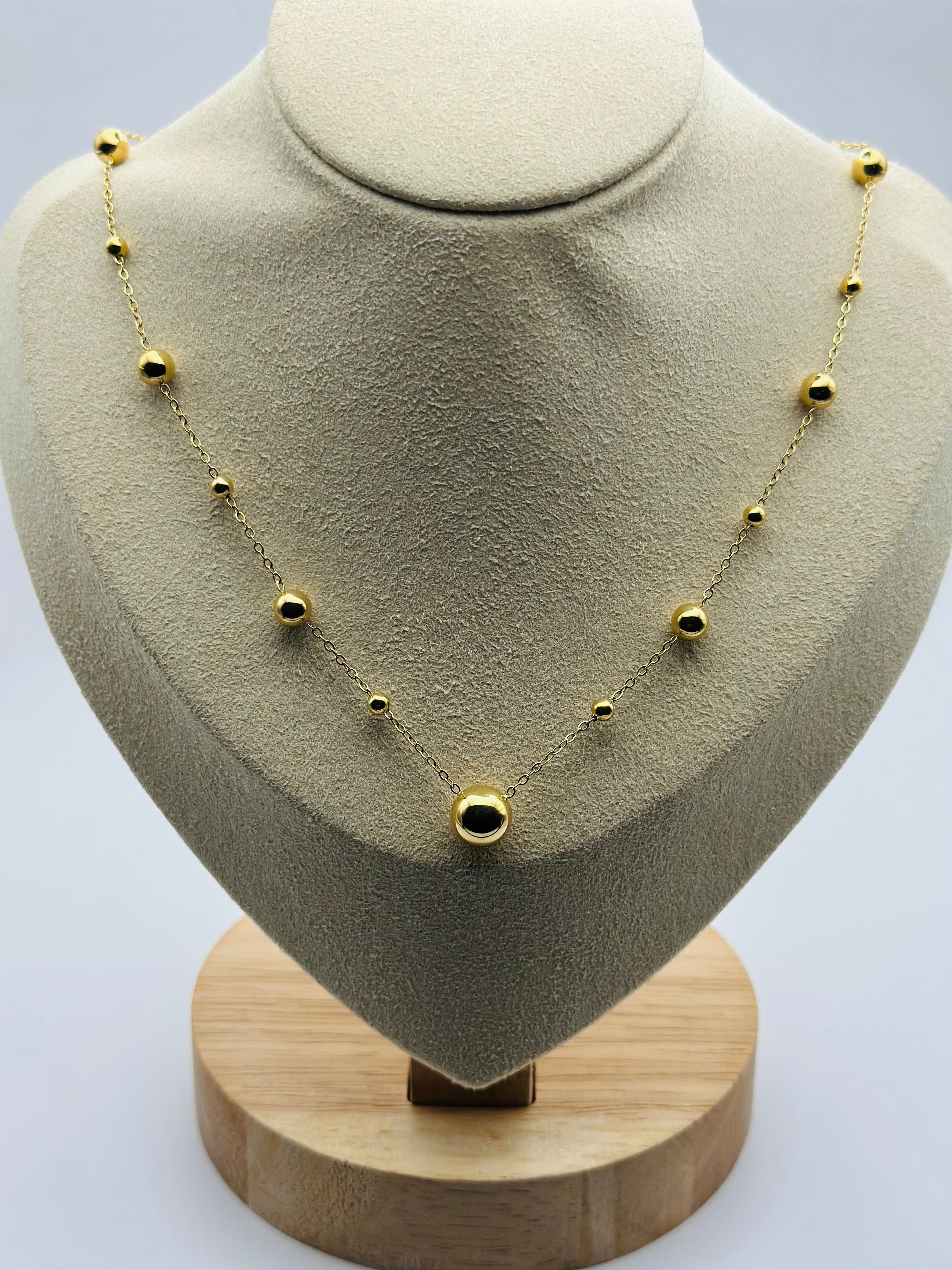 Le collier Mira joue avec les volumes et la lumière. Ses perles dorées, de tailles différentes, sont suspendues sur une fine chaîne pour un effet graphique tout en mouvement. Un bijou aérien, parfait pour illuminer un décolleté avec discrétion et élégance.