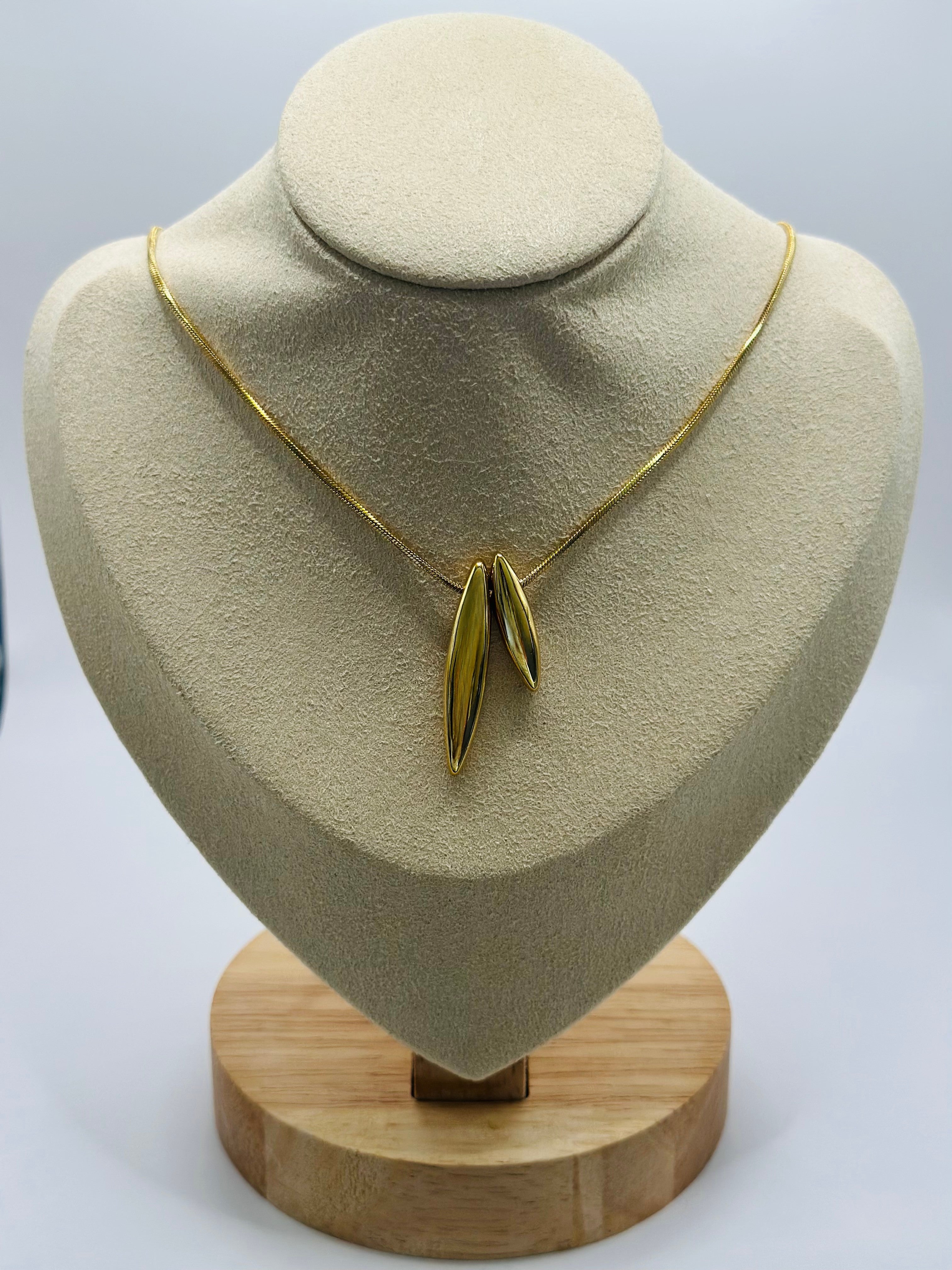 Le collier TWICE séduit par la douceur de ses lignes et la puissance de son design. Ses deux pendentifs en forme de goutte dorée s’équilibrent en parfaite symétrie, créant une silhouette fluide et contemporaine. Un bijou pensé pour sublimer les mouvements, tout en restant intemporel.