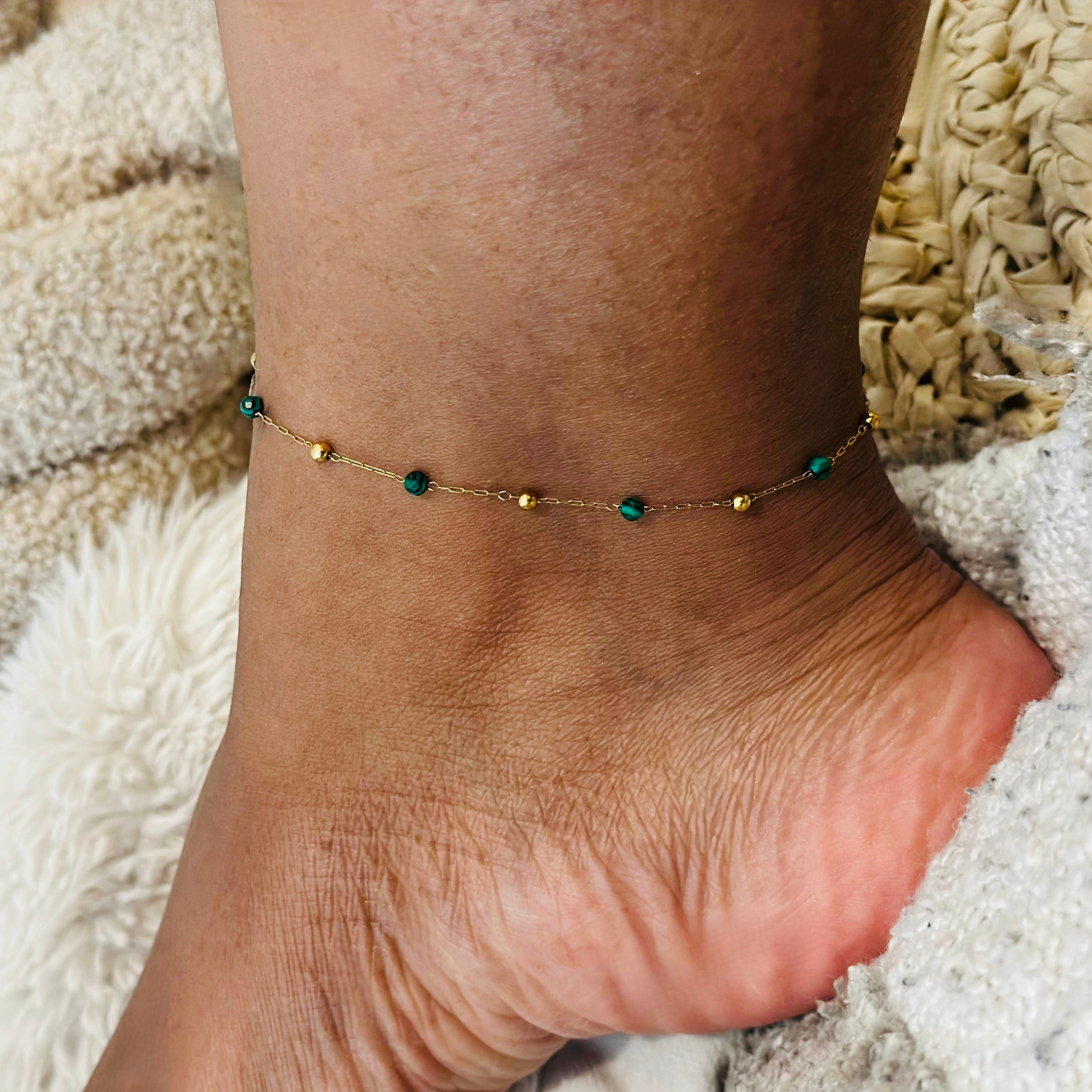 La chaine de cheville Léana sublime chaque pas avec discrétion et lumière. Ses petites perles vert émeraude, mêlées à des billes dorées, créent un contraste vibrant et raffiné. Un bijou d’été qu’on imagine danser sur une peau dorée, au rythme des journées ensoleillées.