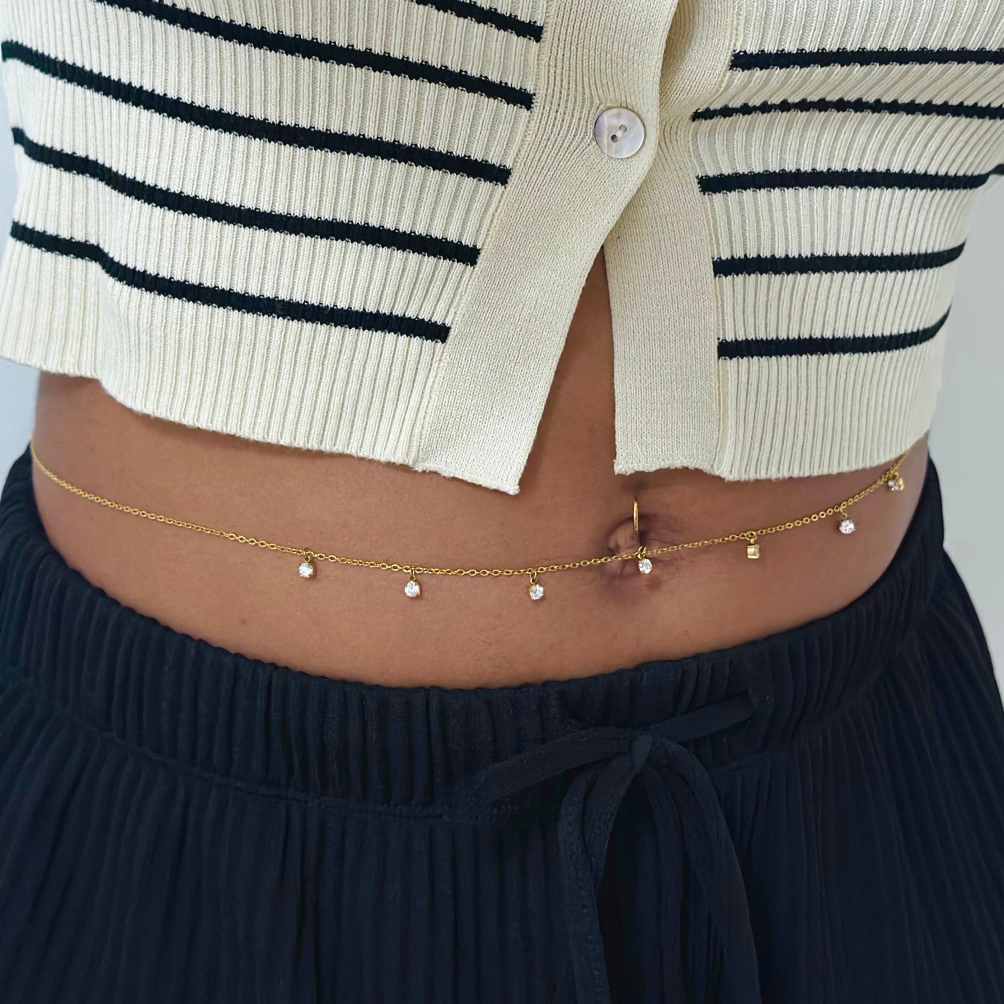 La chaine de taille Alya, délicatement ornée de mini zircons scintillants, est pensée pour sublimer les courbes avec légèreté. Un bijou discret mais plein d’impact.