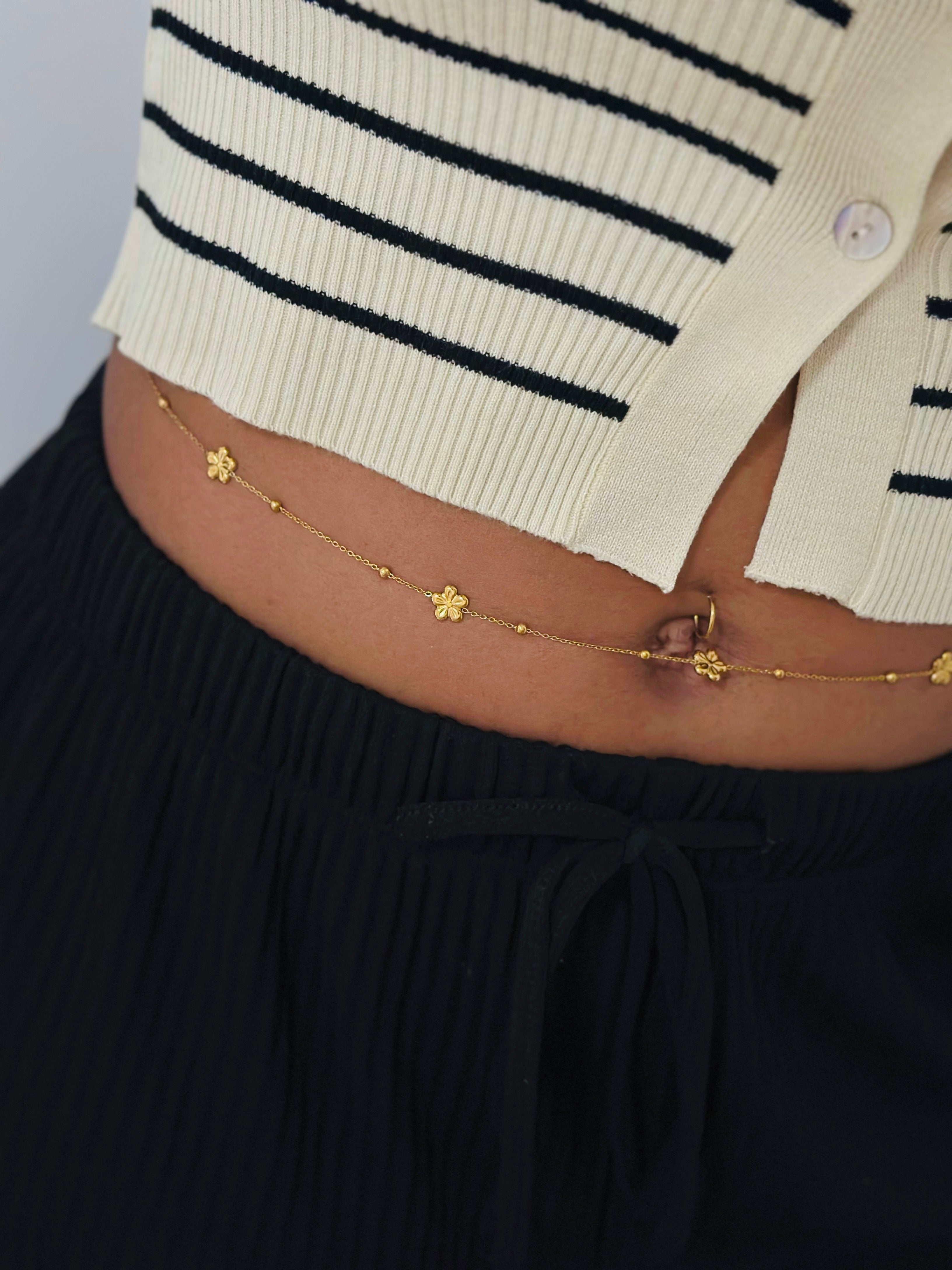La chaine de taille Flora dessine de délicates fleurs dorées. Elle célèbre les courbes avec subtilité. Une pièce précieuse, à la fois douce et puissante.