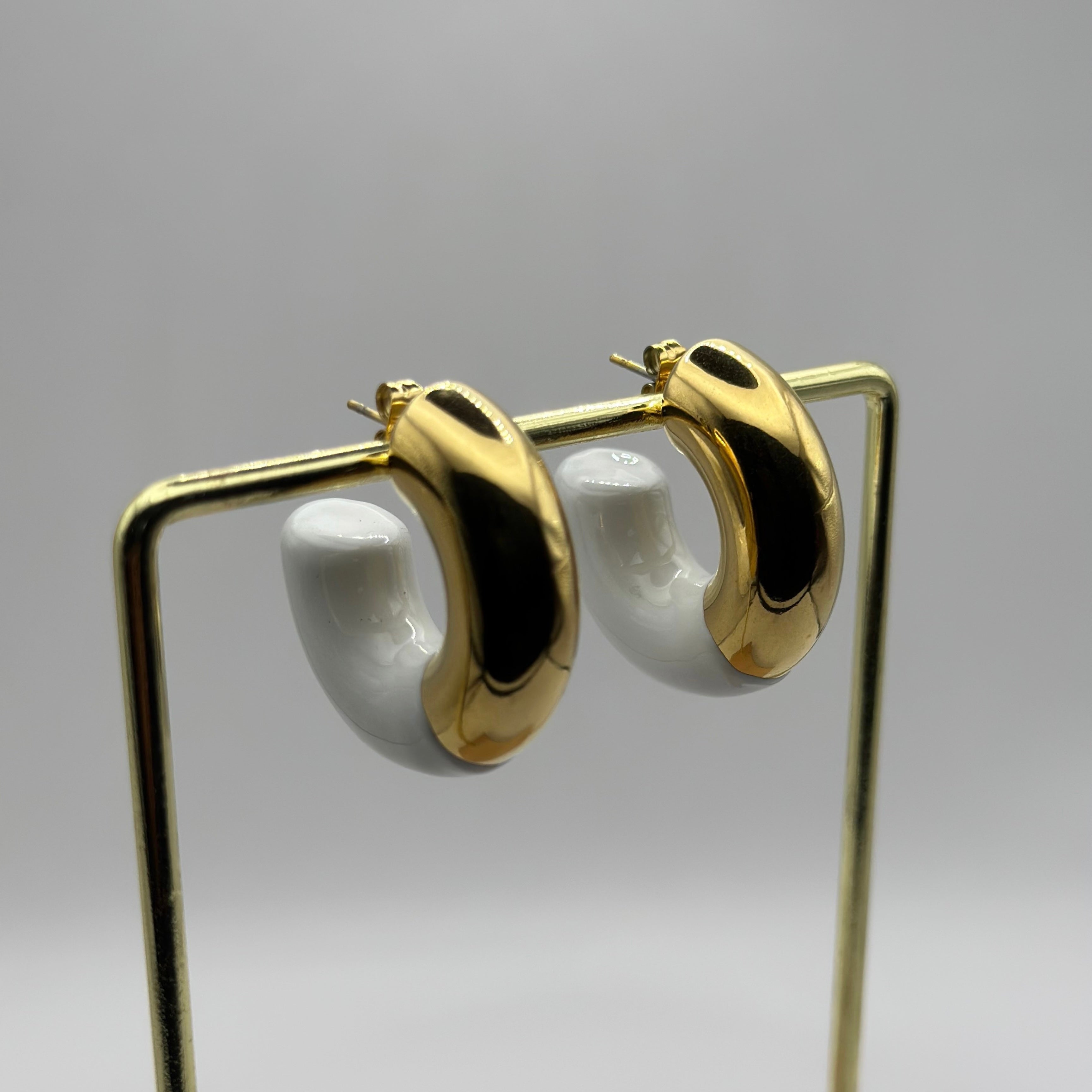 Les boucles Mylène mixent le blanc éclatant et le doré intense dans une forme galbée ultra contemporaine. Entre élégance épurée et audace maîtrisée, elles sont le parfait twist à ajouter à n’importe quelle tenue. Des créoles revisitées, arty et affirmées.
