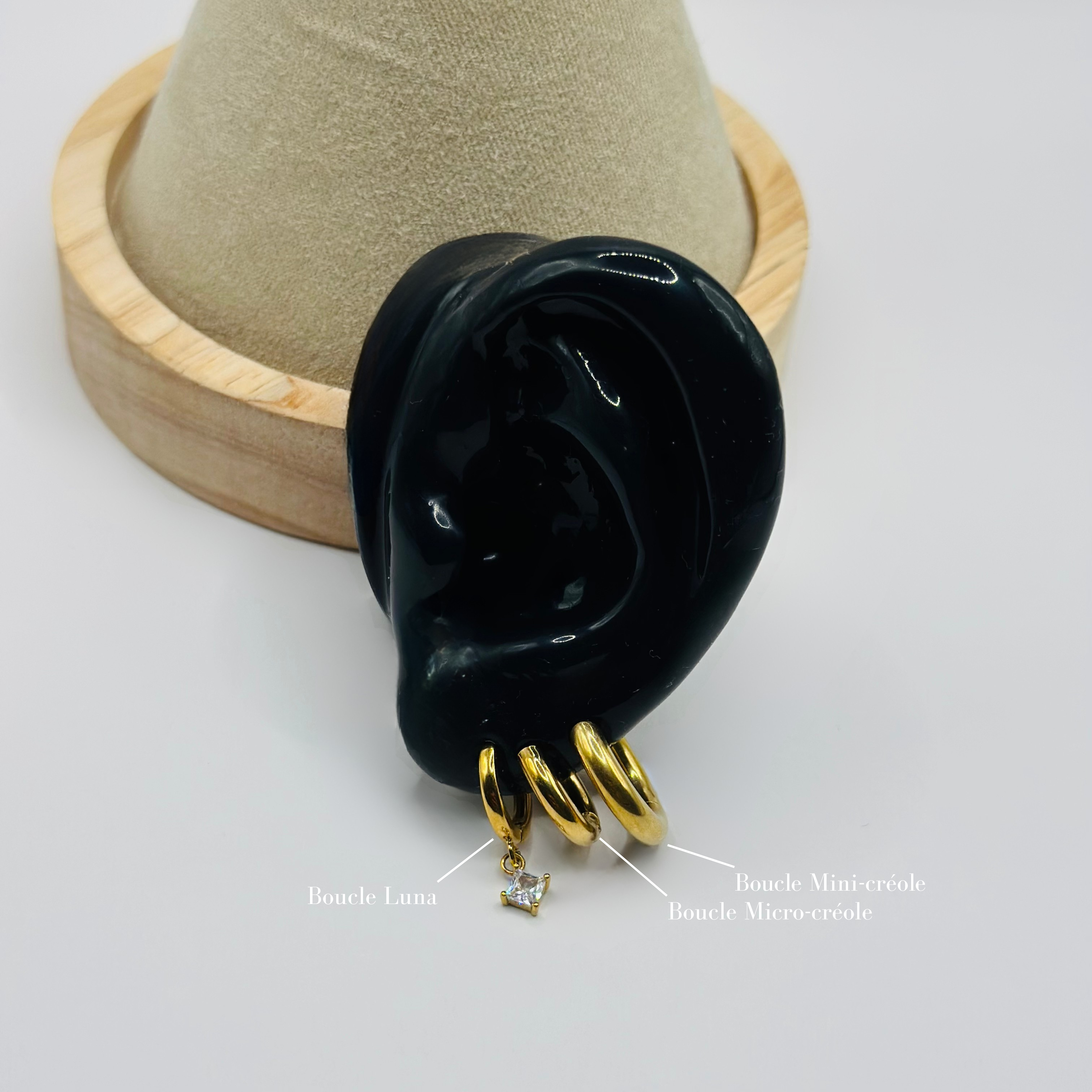 Les boucles Luna jouent la carte de la subtilité. De petites créoles dorées d’où pendent des zircons taille princesse, suspendus comme des gouttes d’éclat. Discrètes, mais jamais invisibles, elles se portent aussi bien en journée qu’en soirée.